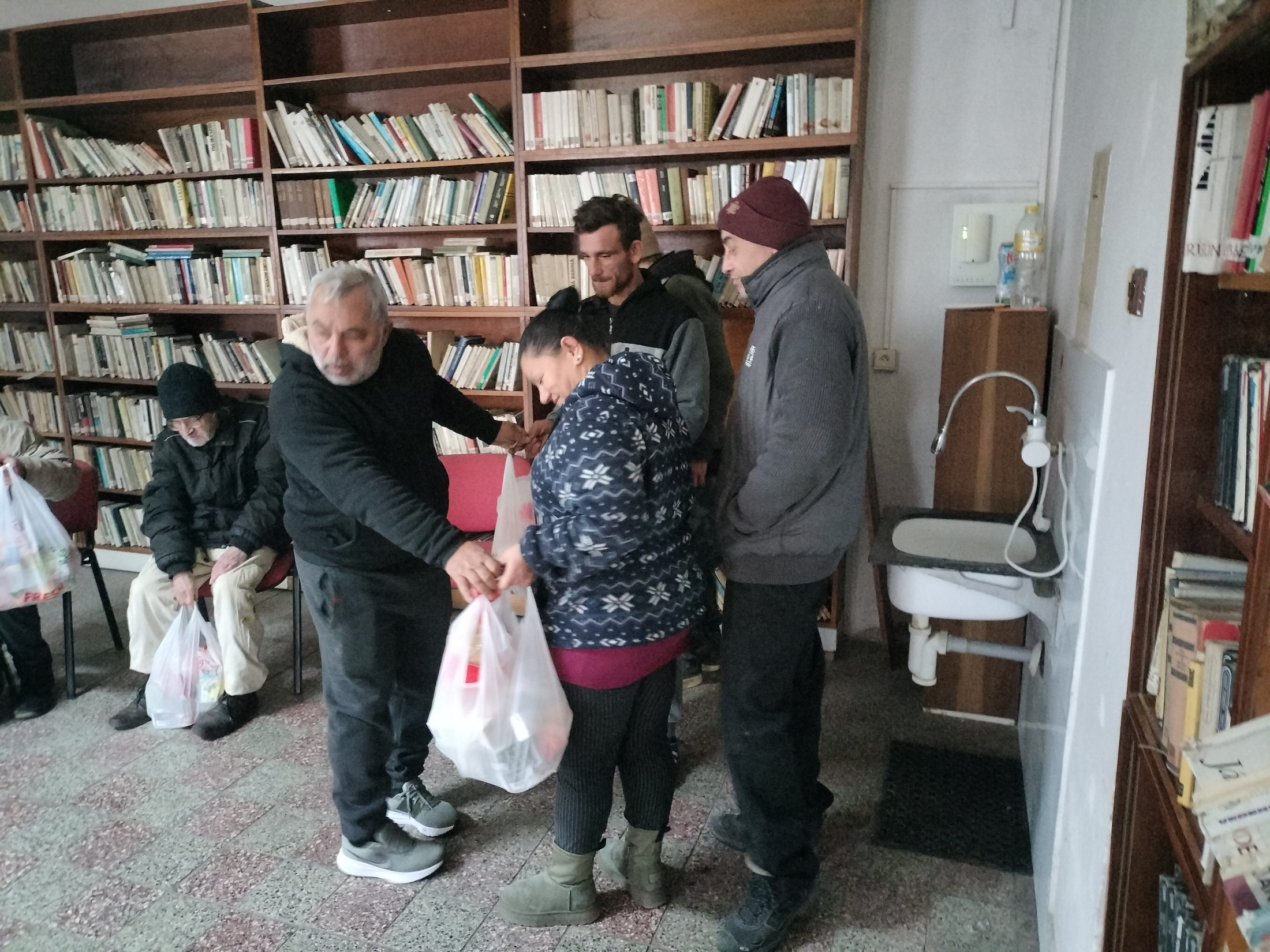 Rozdávanie potravinových balíčkov bezdomovcom / Élelmiszercsomag osztás hajléktalanoknak